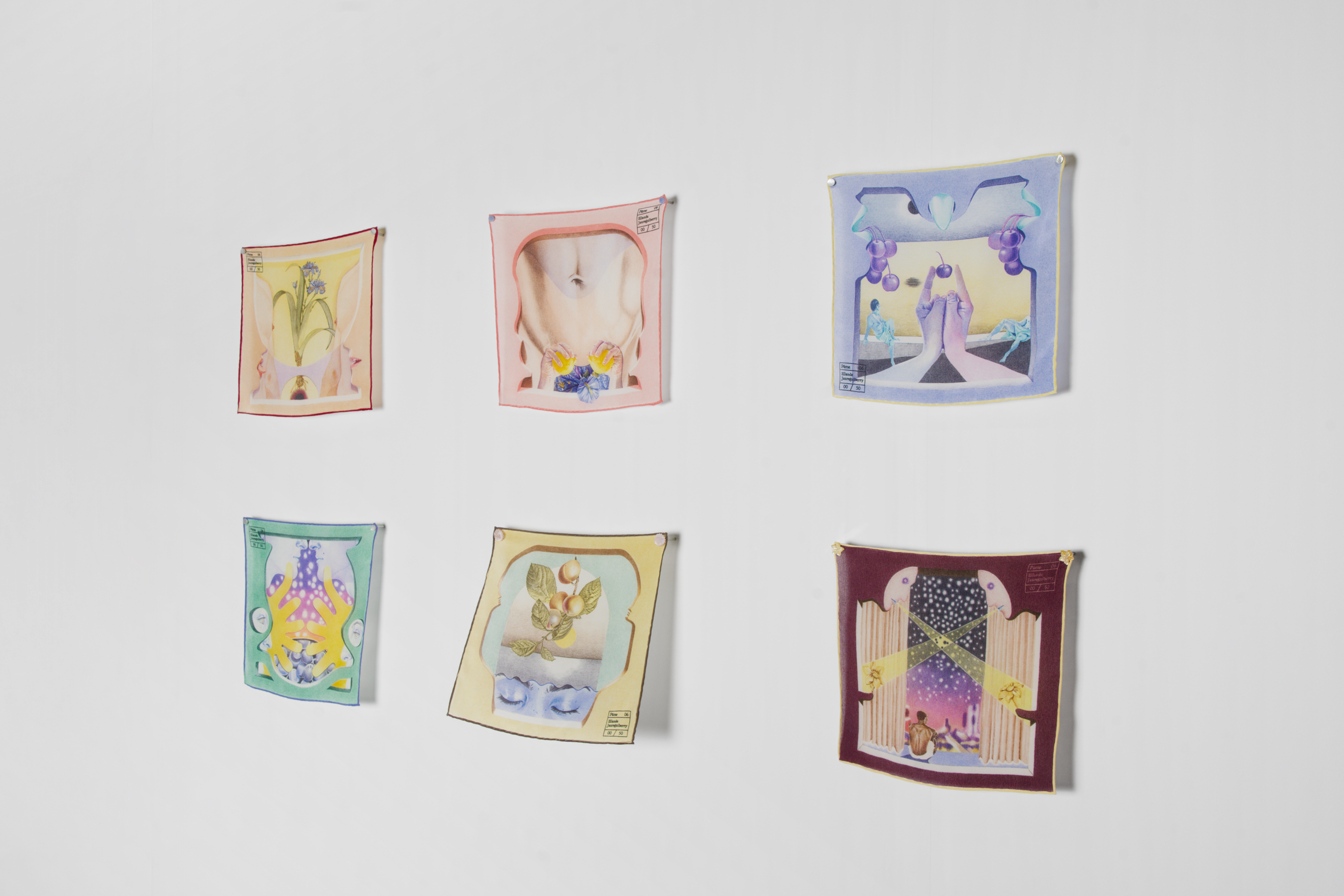 Each drawing represents a month of the year and is framed by imaginary windows, inviting viewers into a delicate, sensual atmosphere where flowers, fruits, and bodies seduce one another within a surreal architecture.